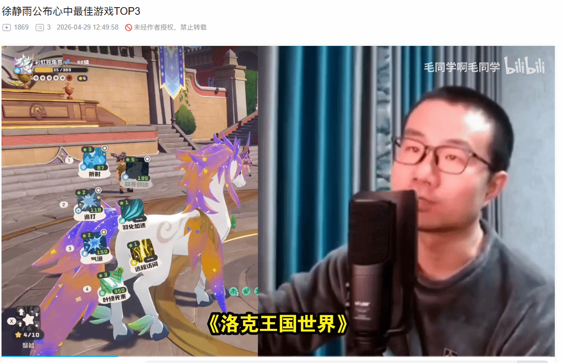 4月29日直播期间,有观众问到他个人心中的最佳游戏前三名,徐静雨没有丝毫犹豫,直接说出了三个作品:《黑神话:悟空》《只狼:影逝二度》和《洛克王国:世界》。