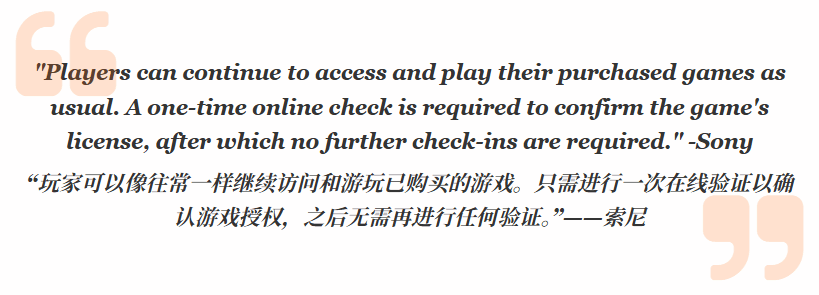 面对玩家的广泛疑虑,索尼迅速发布官方声明,对相关规则进行了清晰澄清。声明明确指出,玩家所购买的数字游戏可正常访问、正常游玩,不存在使用权限上的额外限制,仅需完成一次联网验证,即可确认游戏授权,验证完成后,无需再进行任何重复验证。索尼在声明中明确表示:“玩家可以照常游玩已购游戏。只需进行一次在线检查以确认游戏许可,之后不再需要额外验证。”