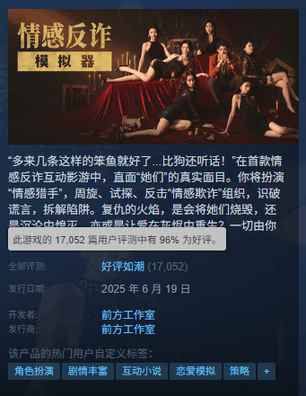 截至发稿,游戏在 Steam 平台已累计获得 17000 + 条评测,好评率高达 96%,获评 “好评如潮” 。玩家对游戏将情感与反诈题材结合的创意给予高度认可。
