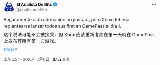 近日,知名游戏测评博主El Analista De Bits就Xbox现状发表看法,指出或许应当重新评估第一方游戏首发即加入Game Pass的策略,这一观点在玩家社群引发讨论。