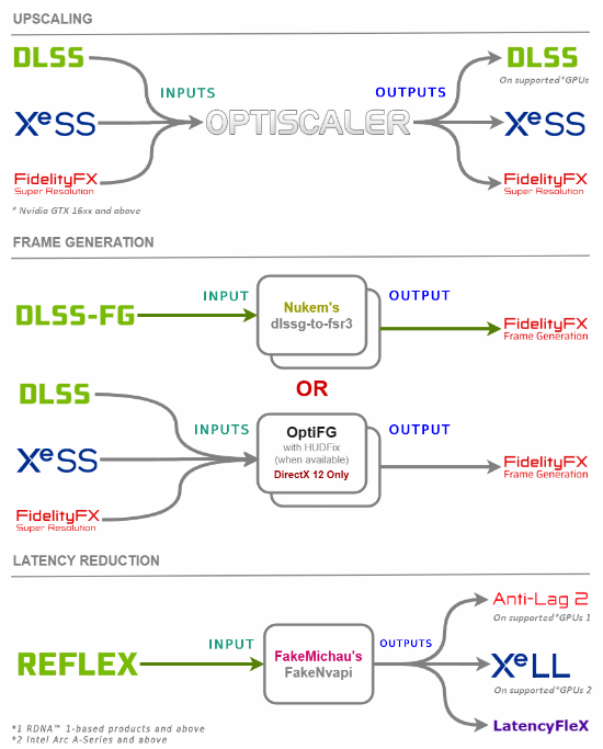 OptiScaler(前身为 CyberXeSS)能够将游戏中的旧版超分技术,如 FSR 2 或 DLSS 等,转换为 FSR 3.1 等较新的技术。例如,当游戏支持 FSR 2 且未更新到更高版本时,OptiScaler 可将 FSR 2 输入转换为 DLSS、XeSS,或者上采样到更新的 FSR 版本。