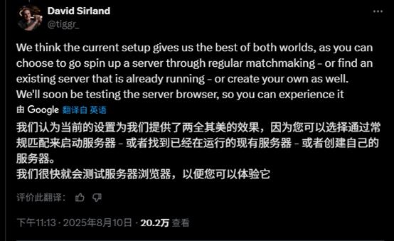 针对玩家在推特上的提问,《战地 6》制作人 David Sirland 回应称,目前游戏的设置其实兼顾了多种需求:玩家既能通过常规匹配进入游戏,也能加入正在进行的对局,还能自行创建专属服务器。他同时透露,服务器浏览器的测试工作即将启动,玩家用不了多久就能亲身感受。
