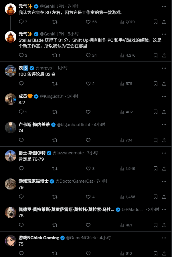 Genki_JPN 预测本作 M 站评分为 80 分,理由是这是开发工作室首款作品,同时提及有 PC / 手游开发经验的 Shift Up,其《剑星》M 站评分为 81 分,可作参考。