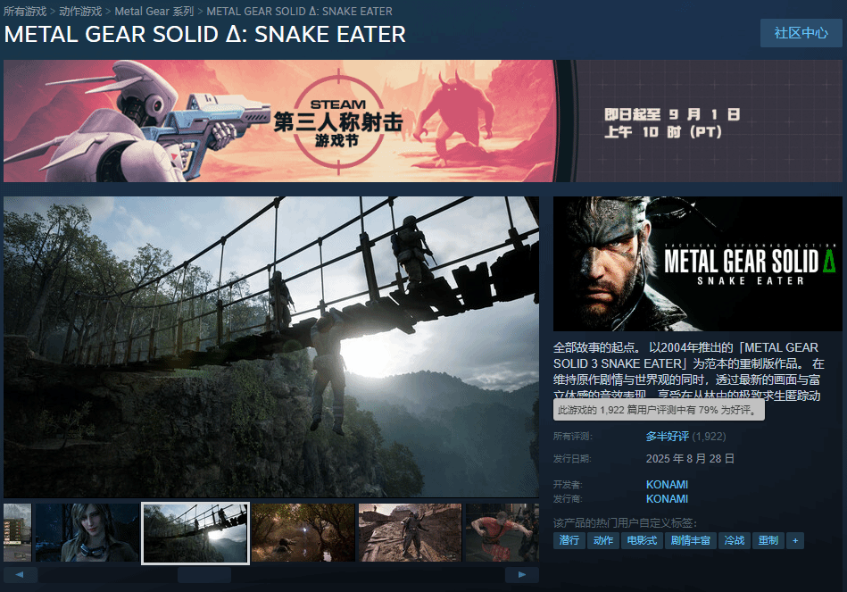 《合金装备 3:重制版》于北京时间 8 月 28 日开启多平台上线,其中 PS5 与 Xbox Series X/S 主机平台的解锁时间为当日 0 点,Steam 平台则推迟至晚上 9 点开放;值得注意的是,购买该作数字豪华版的玩家可享有提前 48 小时进入游戏的权益。截至发稿时,这款重制版作品在 Steam 商店的玩家评价已正式出炉,整体评级为 “多半好评”,具体好评率稳定在 79%。