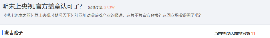这些动态迅速激起玩家群体的热烈讨论。截至本文发稿,相关话题 “坏了真让它洗白了,明末好评飙升” 与 “明末上央视,官方盖章认可了?”,已分别跻身贴吧热议榜第 7 位和第 11 位。
