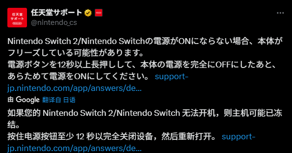 针对玩家反映的Switch或Switch2久置后难以开机的问题,任天堂官方推特于今日发布了相应的解决办法。据官方说明,若主机出现无法启动的状况,首先需考虑是否为系统死机所致。遇到这种情况时,玩家只需长按电源键达到12秒及以上,待设备彻底关机后,再次按下电源键即可完成重启操作。