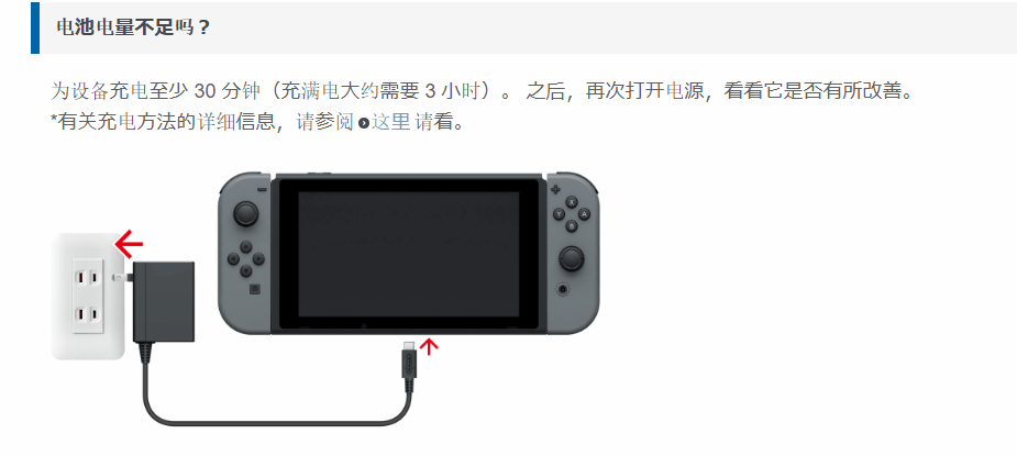除此之外,主机长时间闲置还可能引发电池电量耗尽的问题。对此,官方建议用户将设备连接充电器进行充电,充电时长至少保证30分钟(完全充满电大约需要3小时),充电完成后再按下电源键尝试开机,观察设备是否恢复正常。