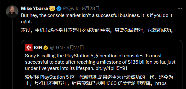 在前几日的东京电玩展上,索尼互动娱乐(Sony Interactive Entertainment)CEO西野秀明公开宣布,PlayStation 5已成为公司历史上财务表现最成功的一代主机。Mike Ybarra针对这条新闻评论道:“主机市场并非一门容易成功的生意,但只要找对方向就能成功。”