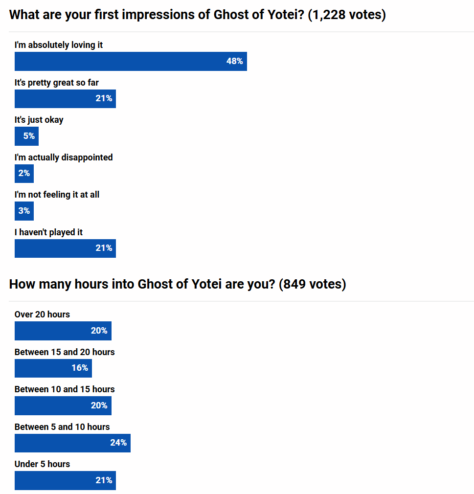 根据Push Square的投票结果,在1200余名参与者中,48%的玩家表示“彻底爱上”《羊蹄山之魂》;21%的玩家认为“目前体验十分出色”;仅有不足5%的玩家觉得游戏“平淡无奇”;而选择“失望”或“完全不喜欢”的玩家比例加起来仅约5%。