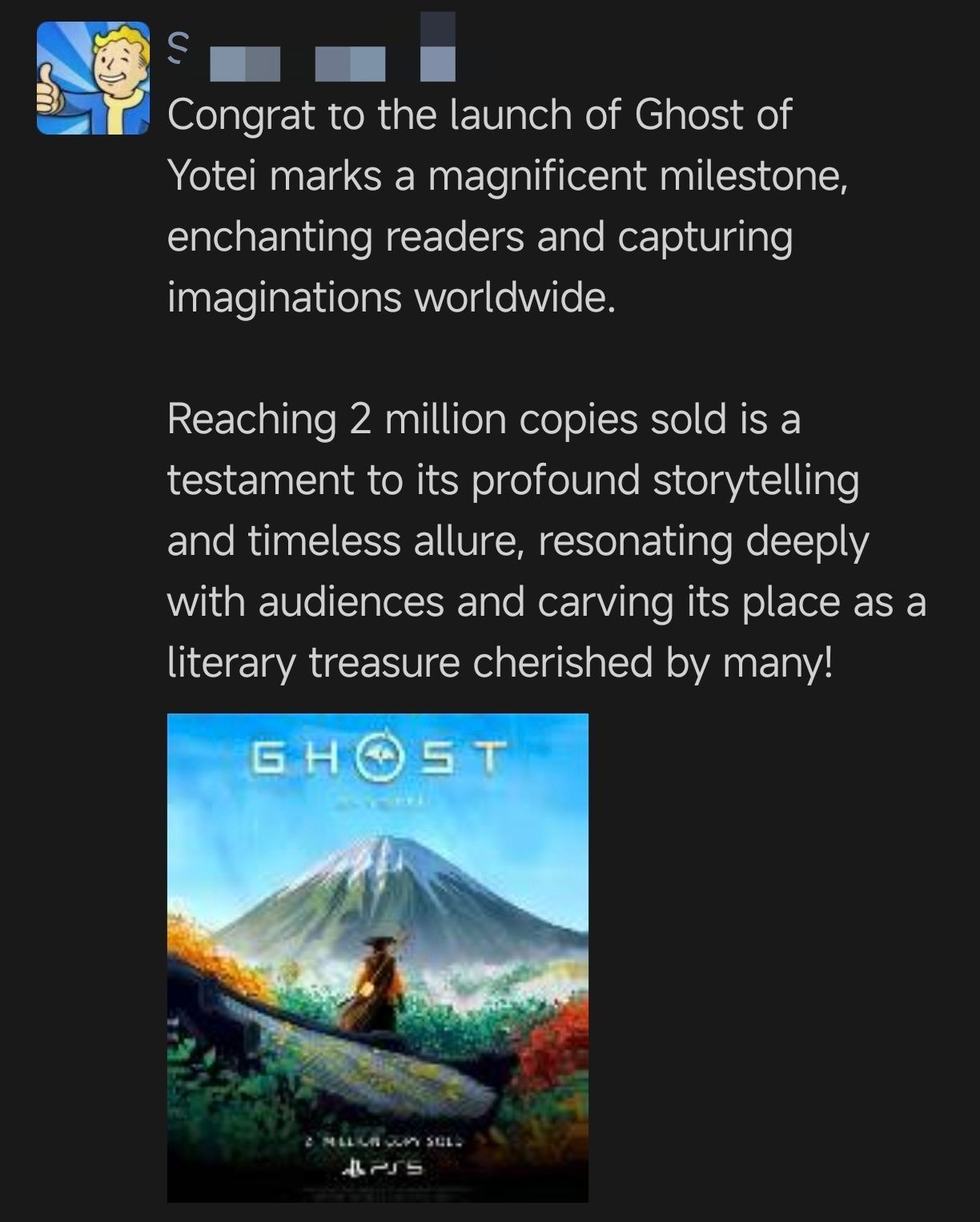 据外媒GamesIndustry.biz记者@DanielOlimac透露,PlayStation中国销售运营总监于近日通过微信朋友圈发布了一条“较为特别”的内容,以此庆贺《羊蹄山之魂》的销量成功突破200万份。