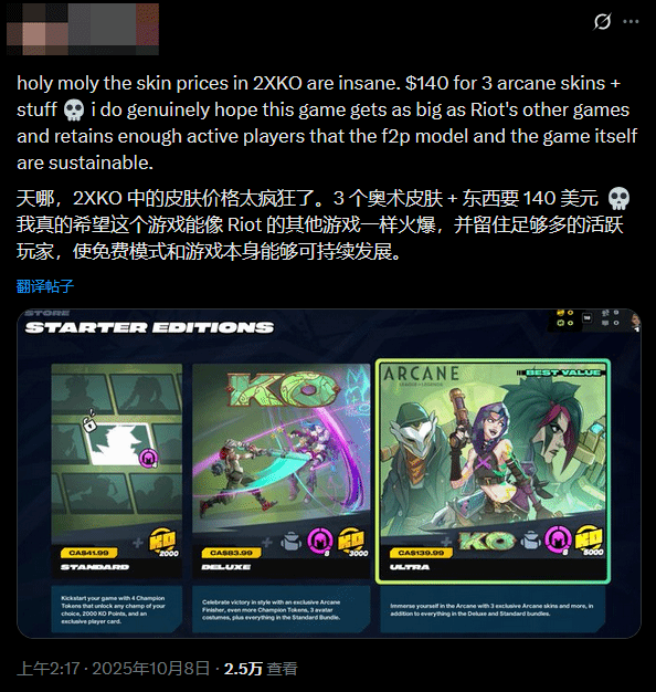 尽管从理论上看,这些内容的总价值确实超过100美元,且《2XKO》本身属于免费游戏,不少玩家早有心理准备会存在氪金元素,但皮肤捆绑销售的模式依旧让许多人感到意外和愤怒。有玩家直言希望推出单独购买选项,“我只玩蔚这个角色。捆绑包本身的价值其实不算差,相当于买了游戏加季票,但皮肤不能单买就有点掠夺性(predatory)了,毕竟有些人可能只想花10到20美元买一个心仪的皮肤。”