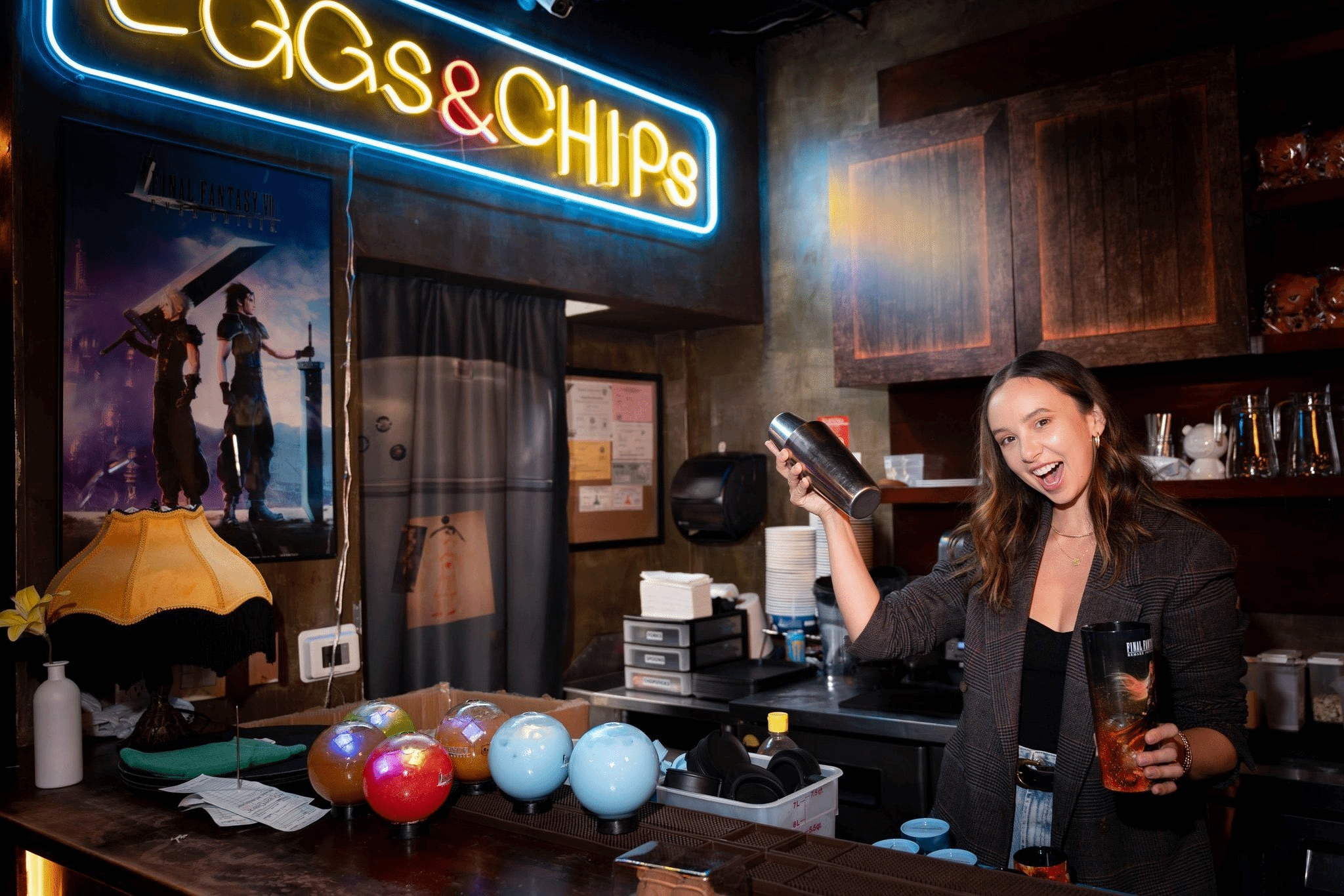 从图片中能看到,配音演员手持调酒杯与萨菲罗斯联名奶茶杯的姿态,这些细节都被3D大神完整还原到了建模之中。