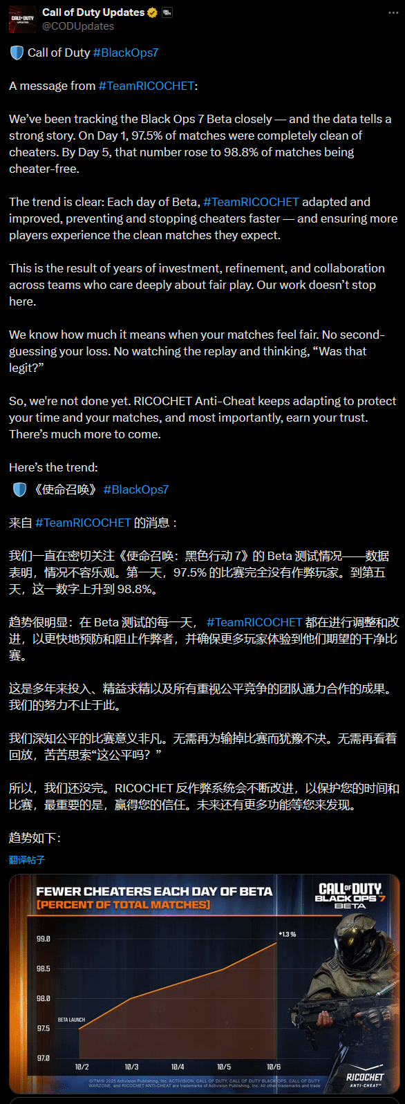 据Tech4Gamers消息,动视旗下反作弊系统Team Ricochet发布最新数据,《使命召唤22:黑色行动7》测试版在B测第5天的对局中,约98.8%的场次未出现作弊玩家。