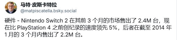 分析师马特·皮斯卡特拉透露,截至2025年8月,Switch2上市首三个月的销量已达到240万台,这一成绩较PS4在2014年1月前创下的220万台纪录高出5%,从而终结了PS4长期保持的美国市场最快销量主机地位。