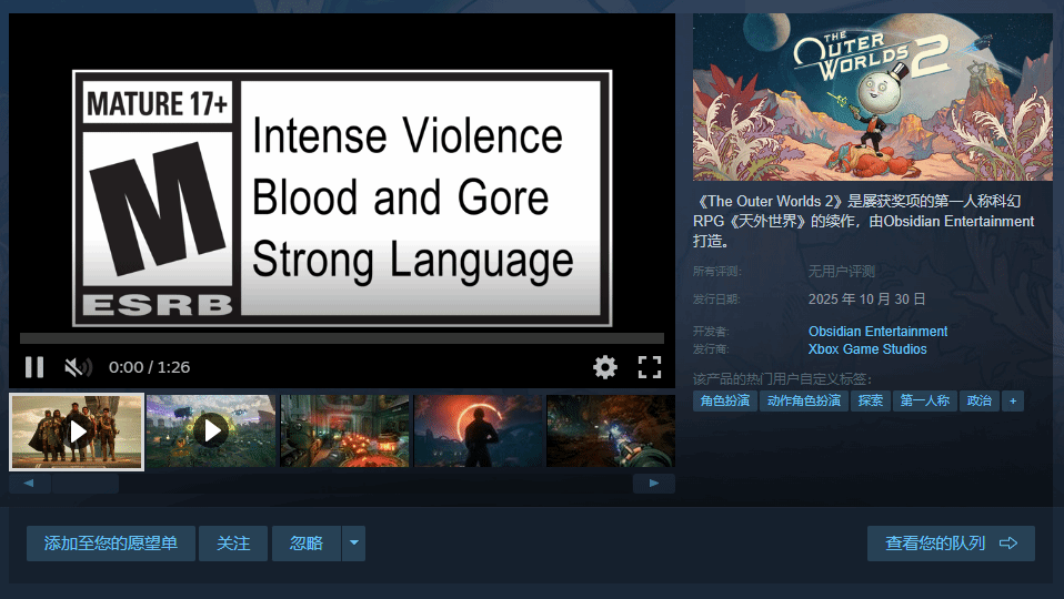 由《辐射:新维加斯》开发商Obsidian Entertainment打造的科幻RPG续作《天外世界2》,今日正式在Steam平台启动预购通道。这款备受期待的作品国区定价公布,标准版为298元,高级版则为498元,游戏计划于2025年10月30日全球同步发售,购买高级版的玩家可享有最多5天的抢先体验资格。