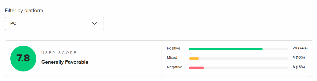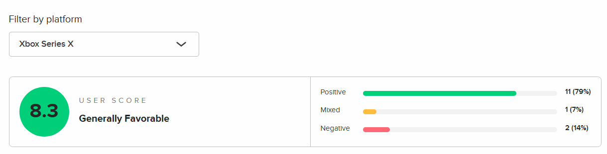 随着发售日临近,游戏的M站玩家评分已正式解禁。截至目前的统计数据显示,各平台评分呈现一定差异:PS5版本获得8.1分,XSX版本评分稍高为8.3分,PC版本则为7.8分。