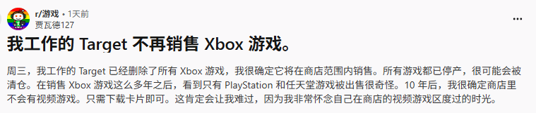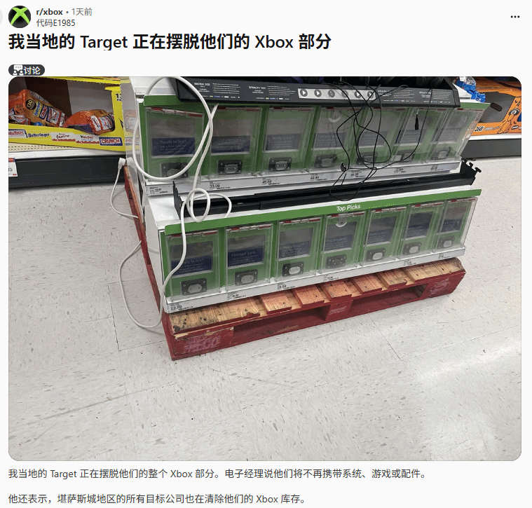 来自Reddit平台、自称分别任职于Target和沃尔玛的网友陆续爆料了这一情况。其中Target员工表示:"我所在的Target门店已经下架了全部Xbox相关产品,包括所有主机、游戏以及配件均已做停售处理,大概率很快会进入清仓阶段。"