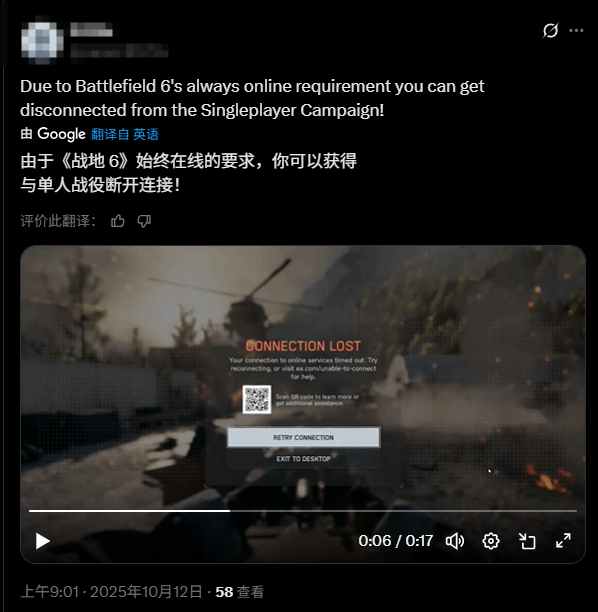《战地6》发售以来,单人战役模式引发不少讨论。有玩家反馈其流程长度偏短、剧情表现平淡,IGN对此模式给出了5分的评价。此外,尽管战役为纯单人体验内容,但强制要求全程联网运行,导致部分玩家在游玩过程中因网络波动出现掉线情况,这一设定也遭到了玩家吐槽。