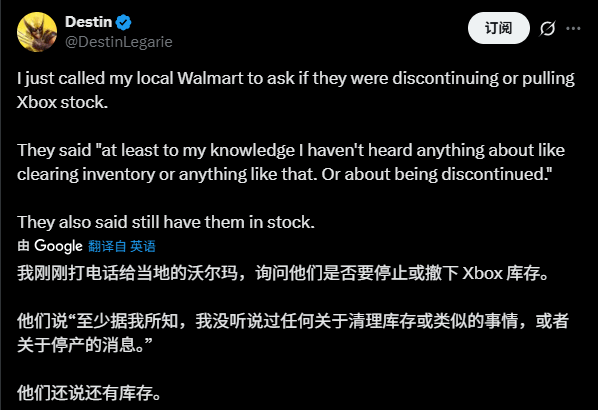 事件源于昨日国外网络传言,有自称Target和沃尔玛员工的网友发帖称,两大零售巨头已开始大规模下架Xbox系列产品。该消息迅速引发游戏圈关注,游戏推主DestinLegarie随即进行求证,他通过电话联系当地沃尔玛门店后得知,对方并未接到清仓下架Xbox产品的通知。