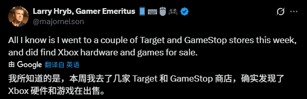 曾在Xbox担任领导职务23年的行业元老Larry "Major" Nelson,也通过个人社交平台分享了实地探访结果。他表示本周先后走访了多家Target和GameStop门店,均看到Xbox硬件与游戏产品正常陈列销售,而沃尔玛门店内Xbox Series X和Xbox Series S两款主机均有现货供应。