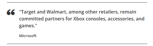 外媒Windows Central也跟进报道了此事。他们不仅向Target方面进行询问,得到了“不存在大规模下架”的否认答复,其编辑还实地走访了当地Target门店,现场观察发现除Xbox主机暂时缺货外,其他相关配件及游戏产品均正常在售。