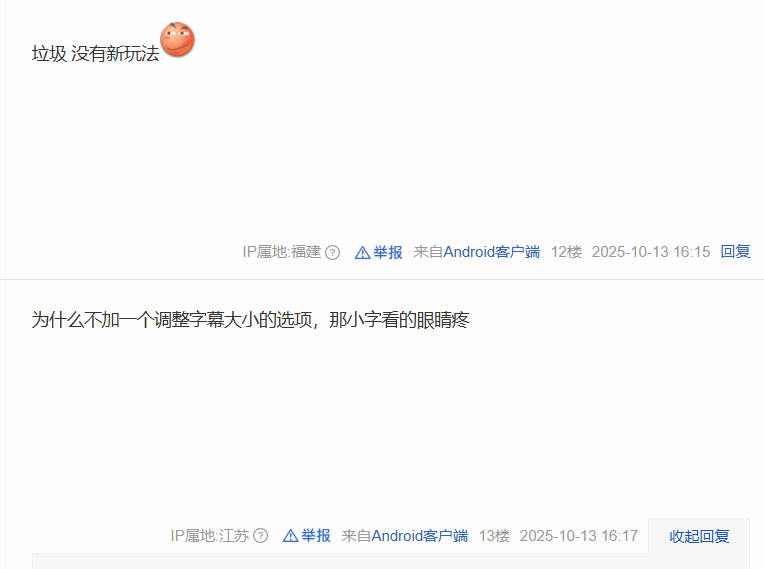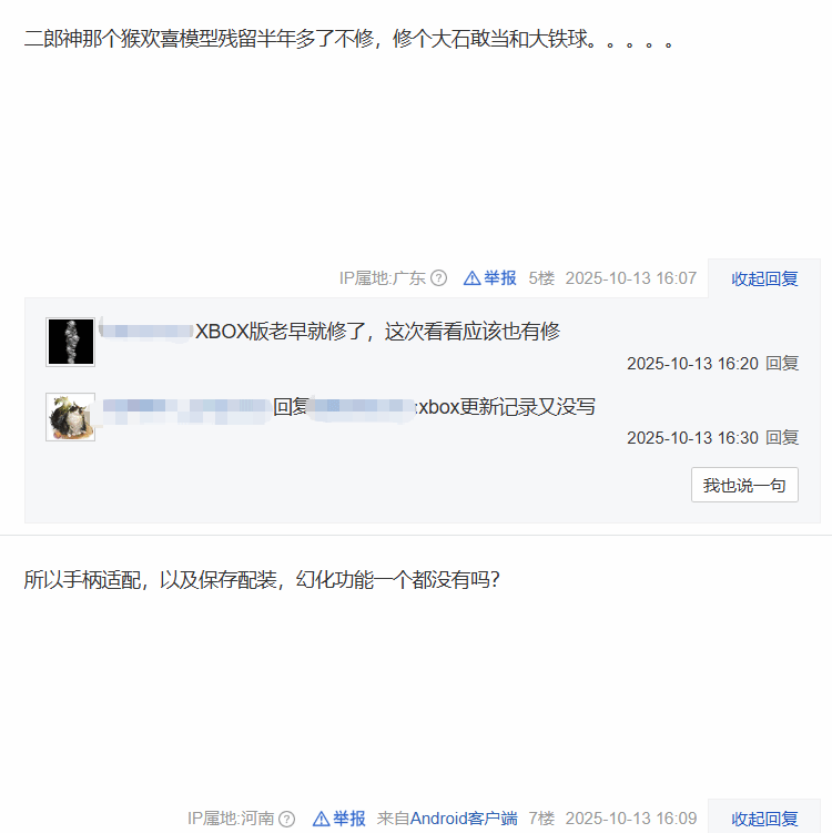 不过,更多玩家对此次补丁持保留态度。部分玩家认为更新内容未达预期,坦言“悬着的心放下了,但期待未满,聊胜于无”。还有玩家质疑常见诉求仍未得到回应,例如“手柄适配、保存配装及幻化功能一个都没加吗?”“为何不增加字幕大小调整选项,小字看得眼睛疼”。也有玩家表示完全“没感到惊喜”,认为补丁缺乏让人眼前一亮的改动。