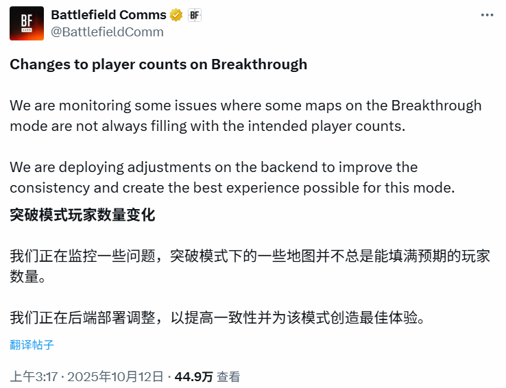 《战地6》正式上线后的48小时内,EA开发团队迅速推出多轮修复更新,切实回应用户提出的各类反馈。上线首日便成功解决了游戏内奖励缺失、内容安装出现异常等问题;到了次日,针对“突破模式”地图中玩家数量未达预期的状况,团队也完成了后台参数调整。
