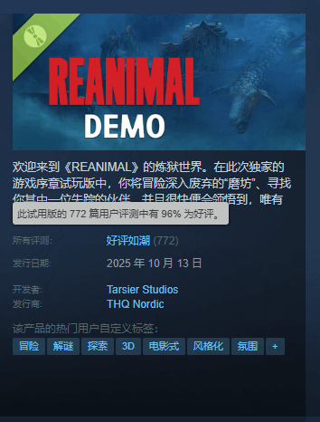 曾打造《小小梦魇》系列的瑞典工作室Tarsier Studios,其全新恐怖冒险作品《REANIMAL》(中文译名《生灵重塑》)已于近日登陆Steam平台开放试玩。这款支持简体中文界面与中文语音的作品,上线后迅速凭借独特的恐怖氛围与扎实的 gameplay 收获玩家青睐。
