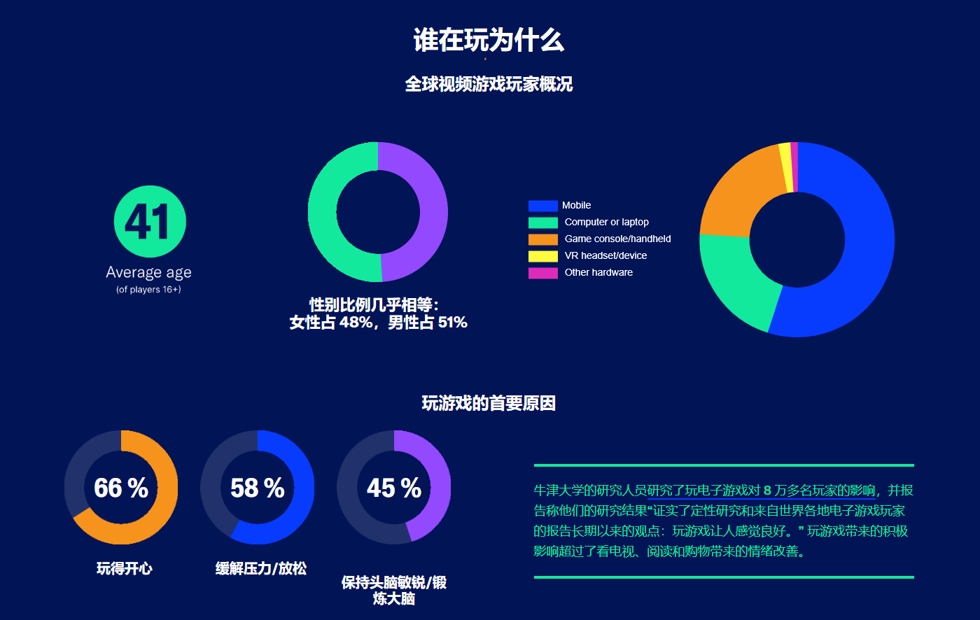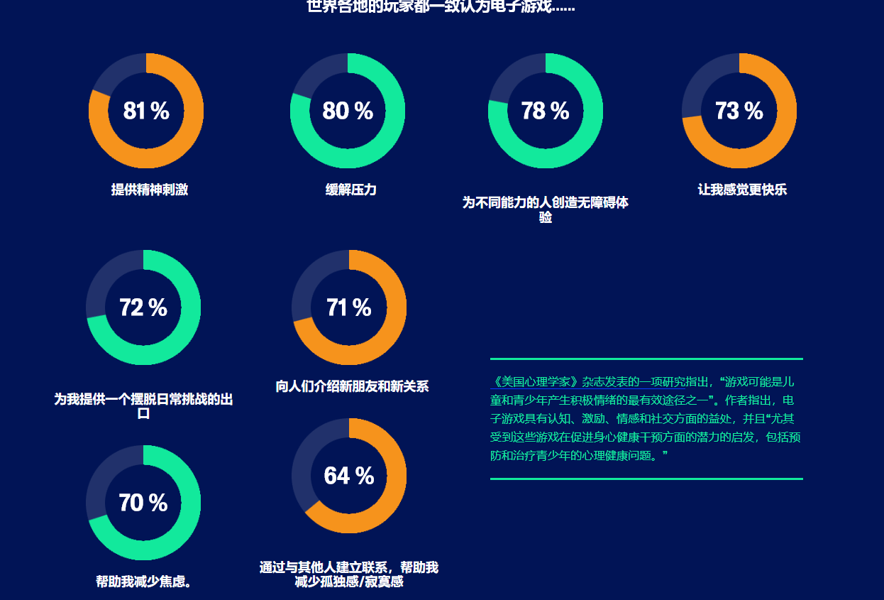 报告综合统计结果显示,本次调查覆盖的玩家群体平均年龄达到41岁,性别分布相对均衡,男性占比51%,女性占比49%。从玩家反馈来看,游戏在全球范围内为用户带来多重积极影响:超半数受访者认为游戏能有效提升愉悦感、缓解生活压力,同时有助于锻炼思维能力;此外,游戏还被视为情绪宣泄的重要渠道,能够帮助玩家减少焦虑情绪,通过社交互动建立人际关系,从而降低孤独感。