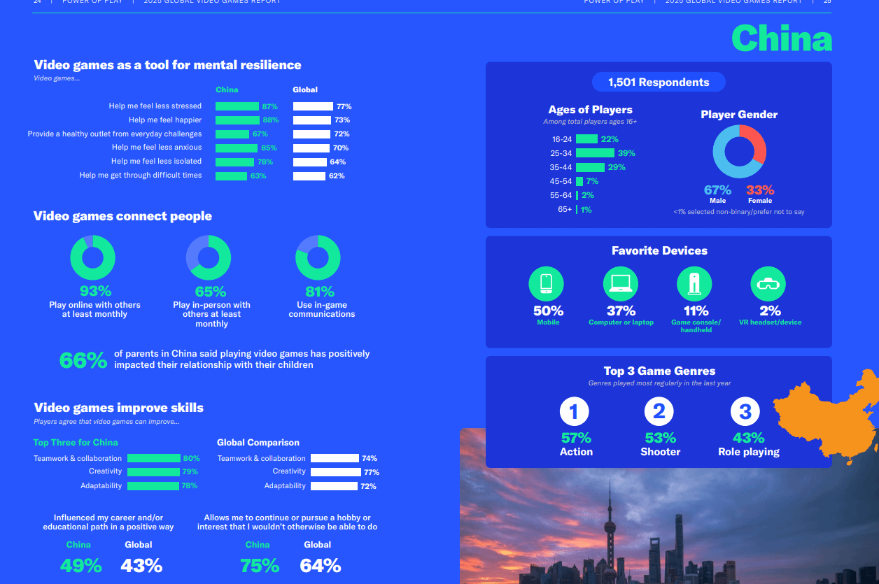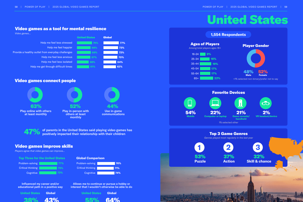 美国娱乐软件协会(ESA)近期发布《游戏的力量》研究报告,针对全球六大洲21个国家的24216名16岁及以上游戏玩家展开深度调研,其披露的数据颠覆了不少人对游戏玩家群体的传统认知。