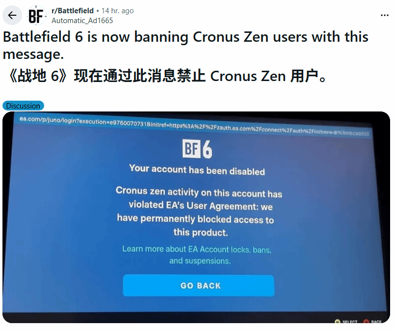 据了解,目前玩家若在运行Cronus Zen的状态下登录《战地6》,账号会被立即触发临时封禁,对于作弊情节严重的用户,甚至会直接处以永久封禁的惩罚。