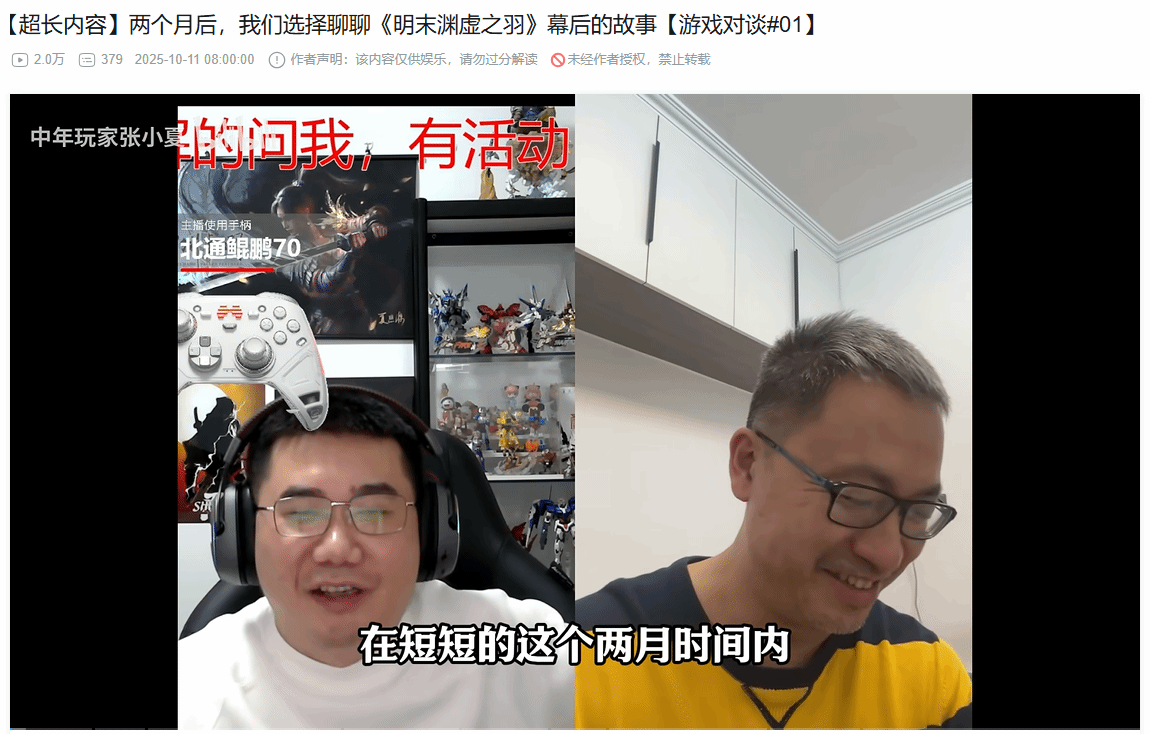 近日,游戏区知名UP主@中年玩家张小夏与@狼叔说游戏开启连麦直播,在直播中分享了《明末:渊虚之羽》的部分幕后故事。两位UP主在直播中提到:“本次对谈内容,均基于走访业内人士及梳理互联网公开信息后的逻辑分析与推断,目的是为玩家提供看待《明末》相关风波的新角度。所有内容无法完全确保真实性,若大家有不同观点,以各位的判断为准。”