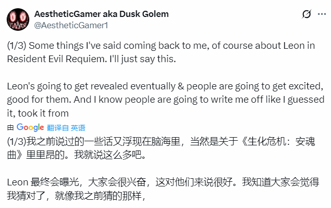 《生化危机》系列知名爆料人Dusk Golem近日再度透露,《生化危机9:安魂曲》将以里昂·S·肯尼迪作为主角,该角色会在游戏发售前正式公开亮相。此次他还分享了更多剧情相关细节。
