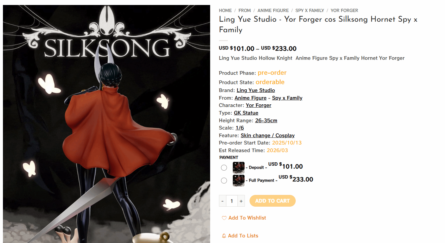近日,Ling Yue工作室公布了《空洞骑士:丝之歌》主角大黄蜂与《间谍过家家》角色Yor Forger的联动1/6尺寸GK雕像。该雕像目前已正式开启预购,高度在26至35厘米之间,配备可拆卸面具,预计于2026年3月发售,售价为233美元(约合人民币1659元)。