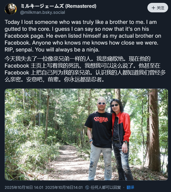 美国出身的游戏制作人兼前媒体人James Mielke(昵称“Milky”)也在个人社交平台证实了该消息,并表达了深切的哀悼之意。作为京都独立游戏展BitSummit的联合创办人之一,James Mielke长期定居日本,深耕独立游戏的推广与开发领域,在当地相关业界颇具知名度。