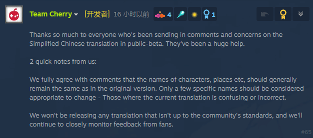 随着这一简体中文基础翻译版本的上线,国内玩家群体中出现大量讨论声音。不少玩家反馈,相比游戏初始阶段的翻译,此次新测版的翻译质量不升反降,部分Boss名称与场景地名的译法甚至显得更为突兀,不符合玩家对游戏内容的认知习惯。针对玩家集中反映的翻译质量问题,Team Cherry于近日正式作出公开回应。