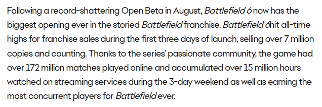 执行副总裁Vince Zampella也补充表示:“我们从未把玩家的支持当作理所当然。在此要向全球《战地》工作室团队以及热情的玩家社群致以诚挚谢意,是大家的努力让我们达成了这一里程碑。感谢各位见证《战地6》的辉煌开局,未来几周我们还会持续为玩家带来更多精彩内容。”