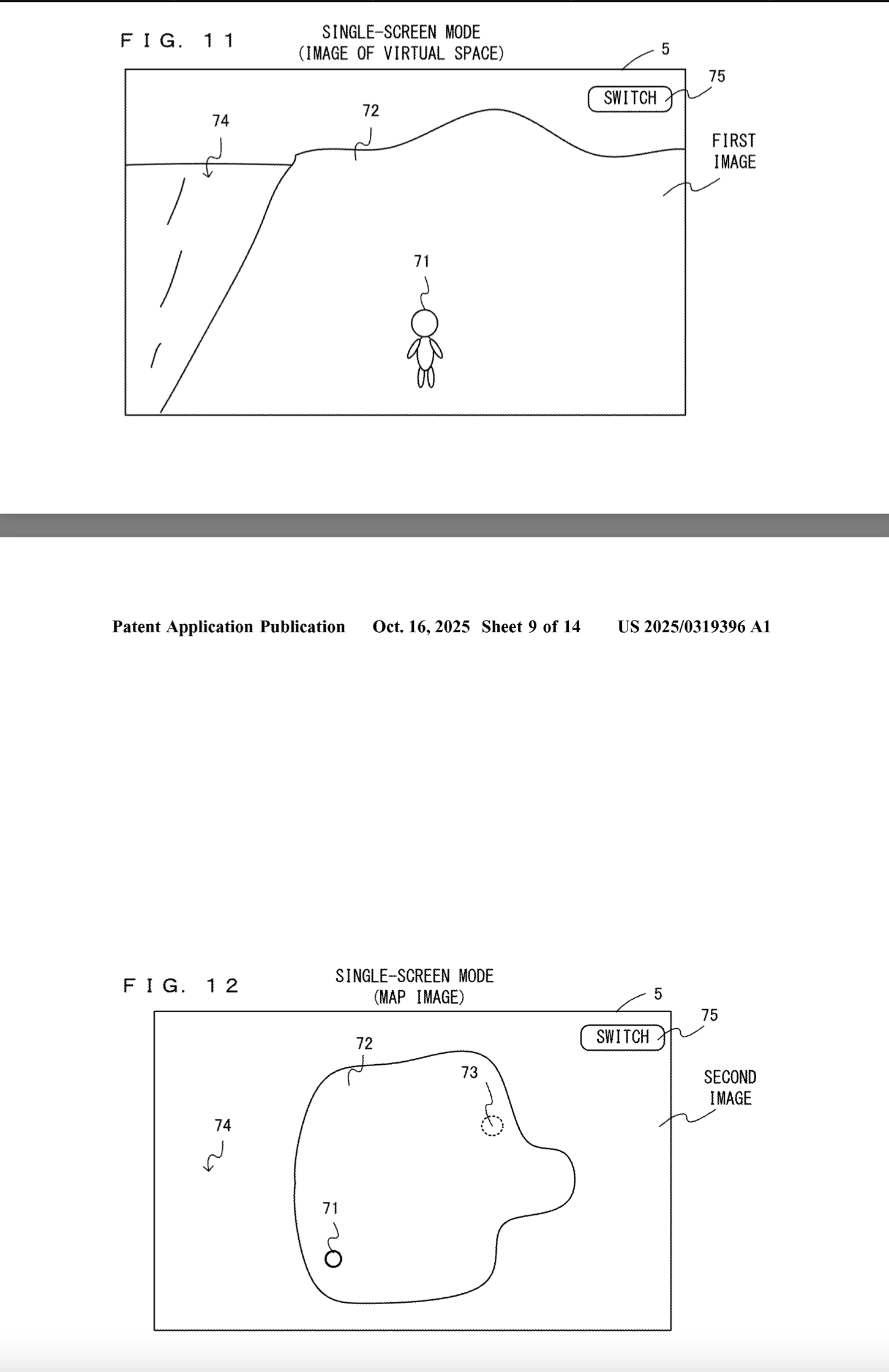 相关信息显示,该专利的核心内容是展示玩家在Switch/Switch 2上运行双屏游戏时的多种显示方案。专利中明确列出了三种显示选项,分别为双屏模式(包含父屏与子屏)、单屏模式(采用画中画形式)以及切换模式(可在不同屏幕间切换)。