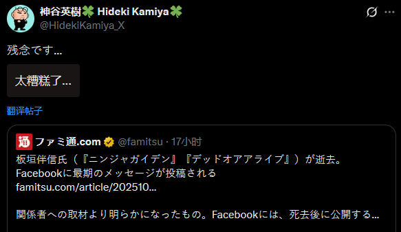 昨日晚间,《猎天使魔女》制作人神谷英树也在推特上发声,对板垣伴信的去世表达悼念之情,感慨“太遗憾了……”。