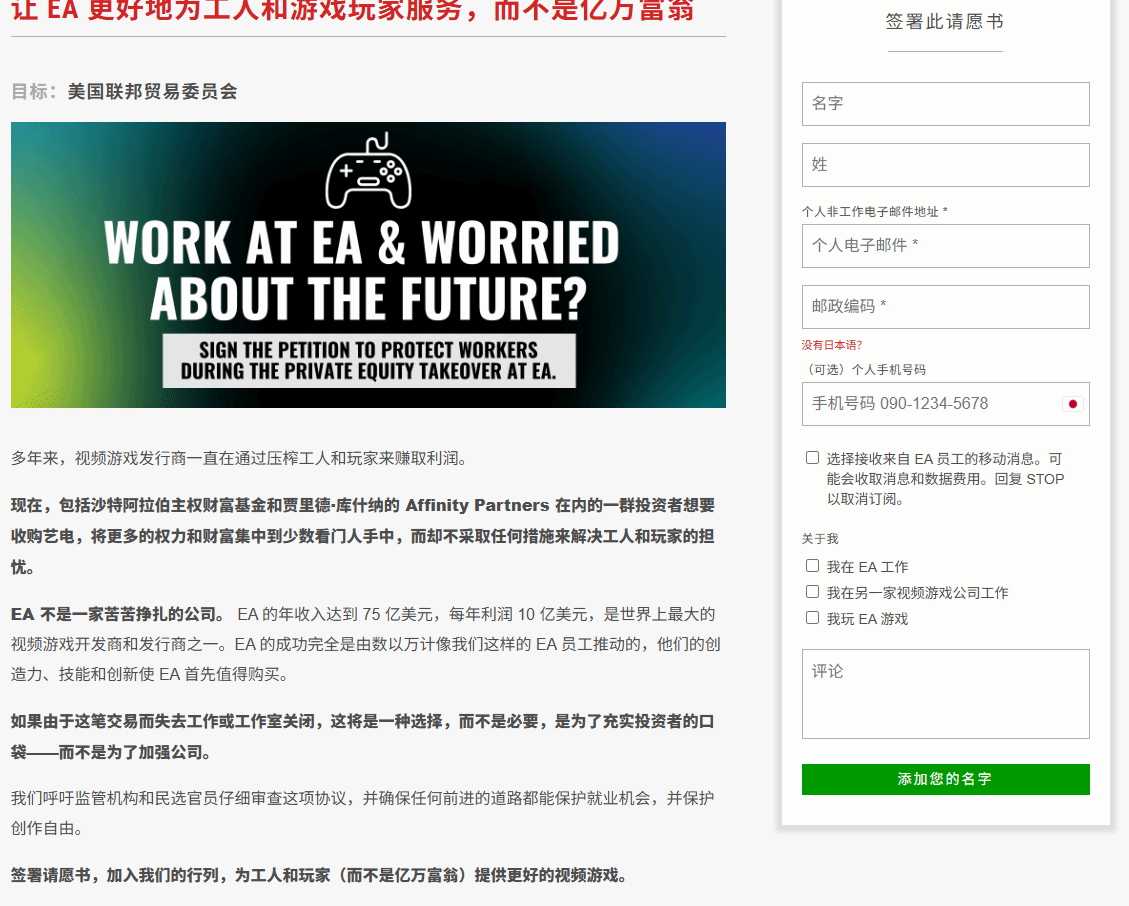 该联合组织表示,这项规模达550亿美元的交易只会进一步强化少数资本巨头的财富与权力地位,对于玩家和劳动者的合理担忧却未采取任何应对措施。声明着重提到:"EA作为全球顶尖的游戏开发商与发行商,年收入达75亿美元,年利润超10亿美元。公司能取得如今的成就,完全依赖上万名员工的努力——是他们的创造力、专业技能与创新精神,才让EA具备了被收购的价值。"
