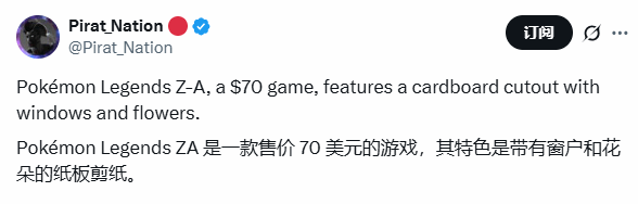 《宝可梦传说:Z-A》已正式登陆Switch 2与Switch平台发售,不过游戏中的部分建模却引发了一些玩家的吐槽。此前,推主@Pirat_Nation在推特上分享了游戏里两处较为显眼的模型,并直言:“《宝可梦传说:Z-A》售价70美元,游戏里却有带窗户和花朵图案的纸板立体场景。”