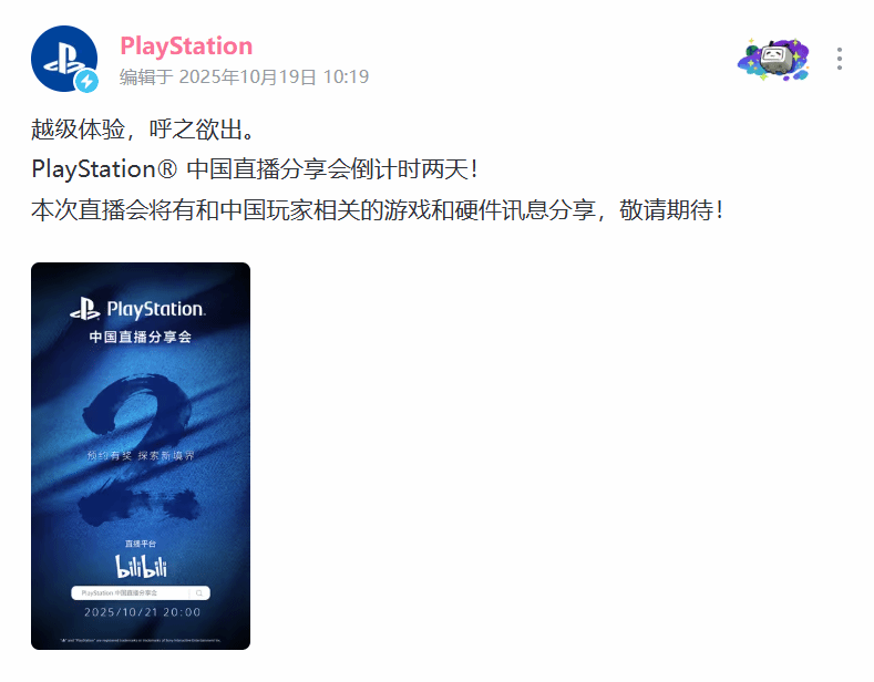 国行主机玩家终于等来了关键信号!PlayStation中国今日发布倒计时两天预热海报,正式宣布“2025中国直播分享会”将于10月21日20:00开启,同时明确表示本次直播将分享“与中国玩家相关的游戏和硬件讯息”,短短一句话瞬间点燃玩家社群的期待。