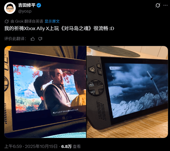 华硕与微软联手打造的新款掌机——ROG Xbox Ally及高端型号ROG Xbox Ally X于10月16日正式开卖,这款融合双方技术优势的设备刚上市便引发玩家热议。而更令人意外的是,前PlayStation总裁吉田修平竟成为首批用户之一,他近期在社交平台分享了入手ROG Xbox Ally X的体验,直言“我的ROG Xbox Ally X玩《对马岛之魂》很流畅!”