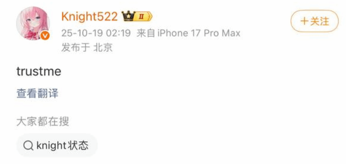 面对舆论压力与晋级危机,BLG中单选手Knight在赛后采访中表达了强硬态度,明确表示希望在下一轮抽签中遇到T1,直言要与这支卫冕冠军战队"决一死战"。而在深夜,他进一步通过微博发声,以"trustme"(相信我)简洁有力地向粉丝传递信心,呼吁大家再给他一次证明的机会。