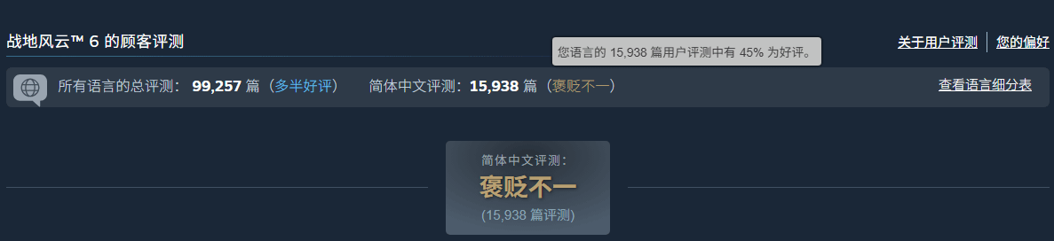 人气射击游戏《战地6》自10月10日正式发售以来,市场表现与玩家评价呈现两极分化。这款国区基础版售价268元、魅影版468元,支持简体中文字幕及全音频的作品,在Steam平台经历了口碑下滑。发售一周后,游戏总好评率从10月11日的77%微降至75%,而简体中文评价区的好评率跌幅更为明显,由56%下滑至45%,整体评价陷入"褒贬不一"区间。