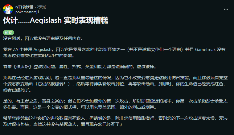 在外网玩家社区Reddit上,有玩家反映人气宝可梦坚盾剑怪的表现不及预期。问题核心集中在其战斗形态切换与专属技能"王者盾牌"的联动上:坚盾剑怪需要先完成形态转换动作,才能释放后续技能,这一设定使得这位原本实力强劲的宝可梦难以完全发挥战力,让不少粉丝感到惋惜。