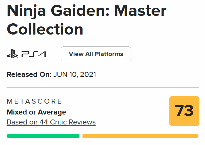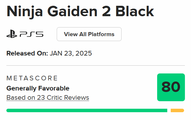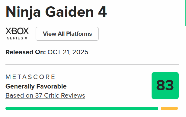 据Twisted Voxel消息,经典动作游戏系列新作《忍者龙剑传4》达成了系列里程碑式成就——自该系列诞生二十余年来,本作成为其3D正统续作中在M站获得评分最高的一作。截至目前,游戏在M站各平台评分中,Xbox Series X版本以83分位居榜首。