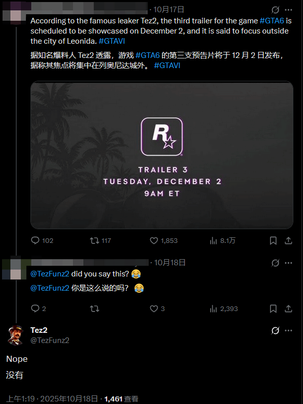 10月17日,有用户称TezFun表示第三支预告片会在12月2日推出。但TezFun随即以简洁的“没有”二字回应,直接否认了这一说法。