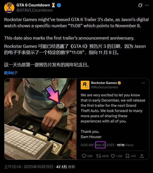 不过即便如此,《GTA6》的粉丝们又锁定了一个新的“有望日期”——11月8日。这个日期不仅是R星当初官宣首支《GTA6》预告片发布日期的周年纪念日,还被粉丝认为在游戏预告片中存在“暗示”。在第二支预告片的某个场景里,男主角Jason将手伸进收银机时,其手表显示的时间恰好为11:08。