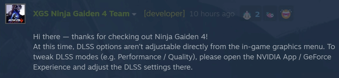 该媒体表示,游戏提供的画质调节选项较为有限,涵盖贴图、阴影、环境光遮蔽、反射和体积雾效果,同时支持风效与动态模糊的开关。游戏兼容NVIDIA DLSS和AMD FSR技术,但不支持Frame Generation帧生成功能;且DLSS画质调整需在游戏外的NVIDIA软件中操作,无法在游戏内直接设置,这一点稍显不便。
